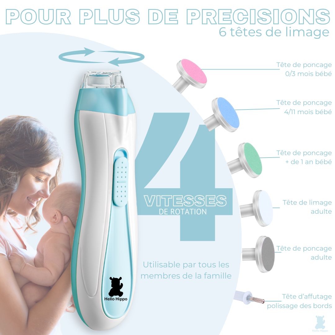 Scopri Hello Hippo, la lima unghie neonato elettrica progettata per garantire sicurezza, igiene e praticità. Con 6 testine intercambiabili e 4 velocità regolabili, si adatta perfettamente alla crescita del tuo bambino, offrendo una cura delicata e sicura fin dalla nascita. Compatto e dotato di una custodia, è ideale per viaggi e spostamenti, mantenendo sempre l’igiene. La sua alimentazione a pile la rende facile da usare ovunque, senza bisogno di cavi o ricariche complicate. Le testine morbide assicurano una limatura precisa evitando graffi e proteggendo le piccole dita del tuo neonato.