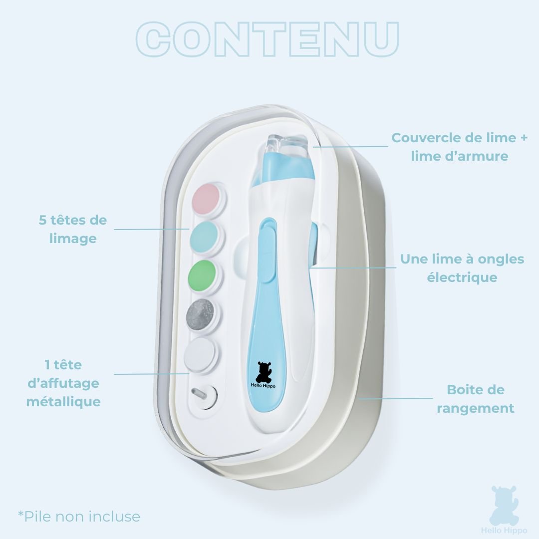 Incluso nel kit, troverai una lima di precisione e un coperchio protettivo, garantendo un utilizzo sicuro e igienico. Questo strumento è pensato per semplificare la vita dei genitori, diventando rapidamente un accessorio indispensabile nella cura dei neonati. Hello Hippo rappresenta un mix perfetto di design e funzionalità, rispondendo ai bisogni di genitori moderni. Fai di Hello Hippo il tuo partner di fiducia per l’igiene del tuo bambino!