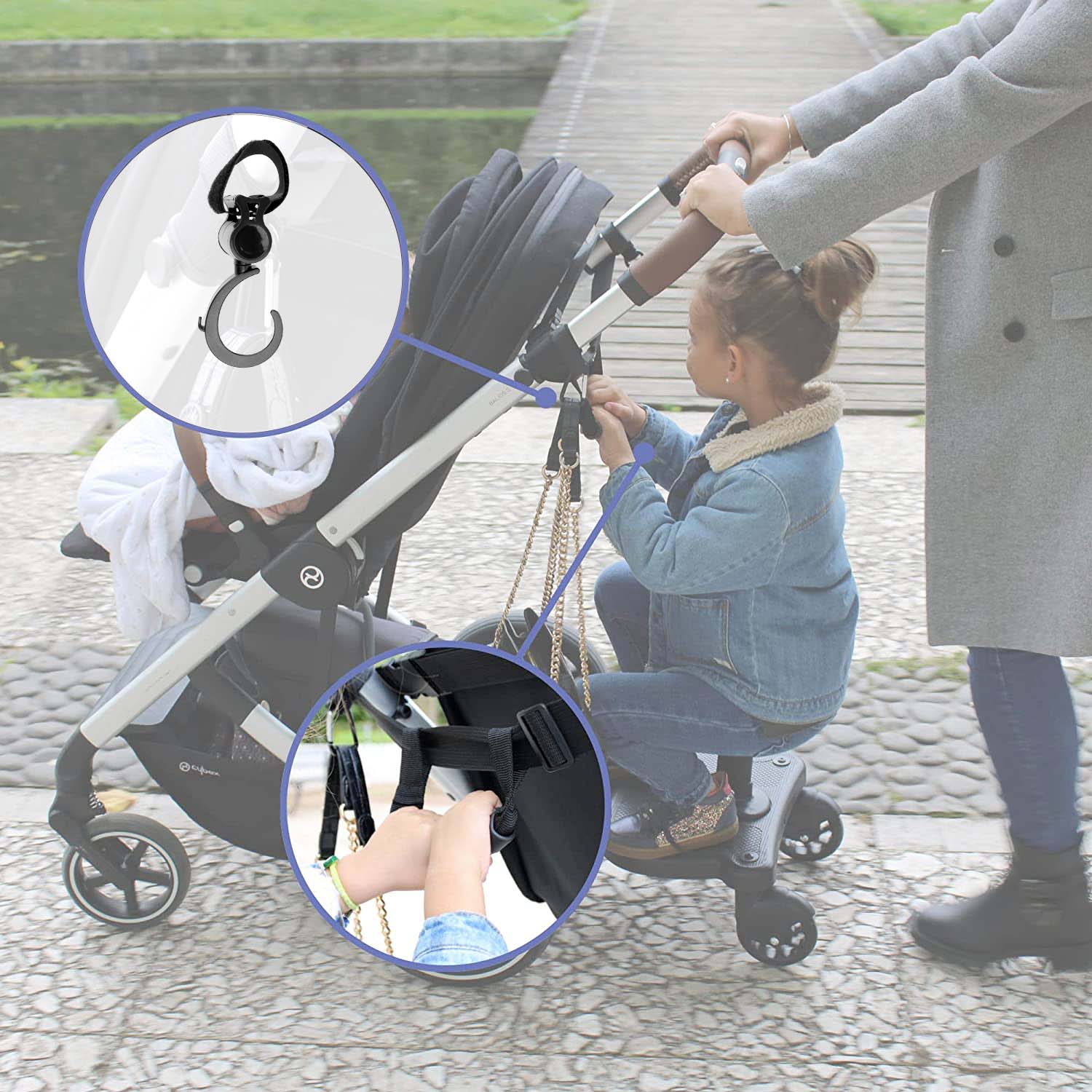 - ACCESSORIO PRATICO: La pedana si aggancia alla barra del passeggino con cinghie regolabili e robuste. Quando non viene utilizzata, può essere riposta comodamente grazie a una cinghia sul retro che consente di agganciarla alla maniglia del passeggino.