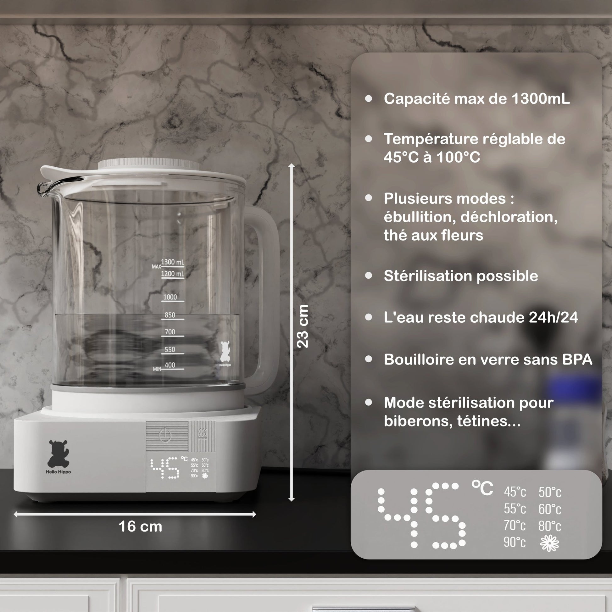 🦛 Offrez à votre quotidien la précision et la tranquillité avec la bouilloire intelligente Hello Hippo®, conçue pour les familles modernes et les amateurs de boissons chaudes exigeants. Grâce à son thermostat réglable de 45°C à 100°C, préparez vos biberons, infusions, chocolats chauds ou soupes à la température idéale, sans compromis sur la sécurité ni la qualité.